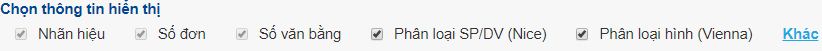 - Ví dụ: Muốn tìm kiếm thông tin về các nhãn hiệu “HONDA”, đăng ký cho sản phẩm xe máy, Người dùng (i) Nhập từ khóa “HONDA” vào trường Nhãn hiệu; (ii) Nhập từ khóa “XE MÁY” vào trường Tên sản phẩm /dịch vụ (SP/DV); (iii) Nhấn Tra cứu: Màn hình kết quả sẽ cho thông tin về số “kết quả” tìm được là số đơn/Bằng liên quan nhãn hiệu “HONDA” đã đăng ký cho các sản phẩm xe máy và Bảng kê chi tiết từng kết quả đó. Tại màn hình hiển thị người dùng sẽ lựa chọn thông tin cần được hiển thị như Số đơn/Số Văn bằng/ Tên nhãn hiệu/Phân loại sản phẩm – dịch vụ hoặc các thông tin khác.